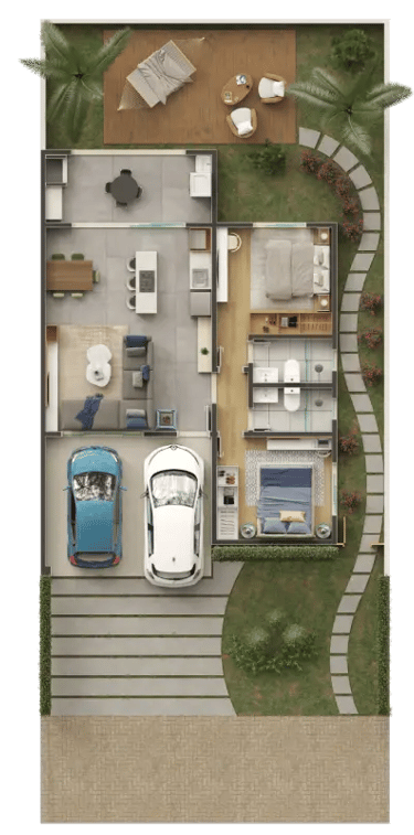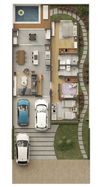 Você escolhe a metragem ideal, a configuração com 2 ou 3 quartos e se prefere a sua casa com ou sem piscina.